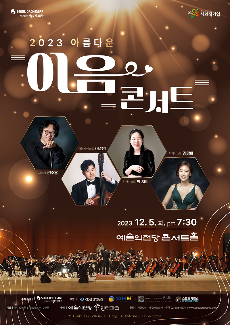 (사)서울오케스트라 전임지휘자 권주용의 지휘로 금관악기의 화려한 팡파르와 경기병 행진의 표현이 인상적인 쥬페의 <경기병 서곡>을 시작으로, 베이시스트 이준영은 이탈리아 출신 비르투오소 콘트라베이스 연주자이자 낭만주의 작곡가인 보테시니의 두 번째 콘트라베이스 협주곡을 연주한다. 콘트라베이스의 파가니니로 불리우던 보테시니는 총 세곡의 콘트라베이스 협주곡을 작곡하였는데 특히 두 번째 곡은 거대한 현악기의 풍성한 탄력과 정교한 에술적 기교를 표현한다. 이어서 피아니스트 박송이는 노르웨이의 대 자연의 풍경과 서정을 형상화한 그리그의 피아노 협주곡 1악장을 연주하며 전반부를 마무리한다. 2부는 피아니스트 김경아가 베토벤 피아노 협주곡 3번을 연주하며 시작한다. 베토벤 국제 콩쿨 우승도 경험한 피아니스트 김경아의 절망과 희망이 혼재된 베토벤 특성이 잘 나타난 연주를 기대할 수 있다. 마지막으로 따스하고 활기찬 분위기를 주는 크리스마스 캐롤을 편곡한 크리스마스 페스티발이 연주되며 모든 관객의 마음을 잇는 이음콘서트의 막을 내린다.