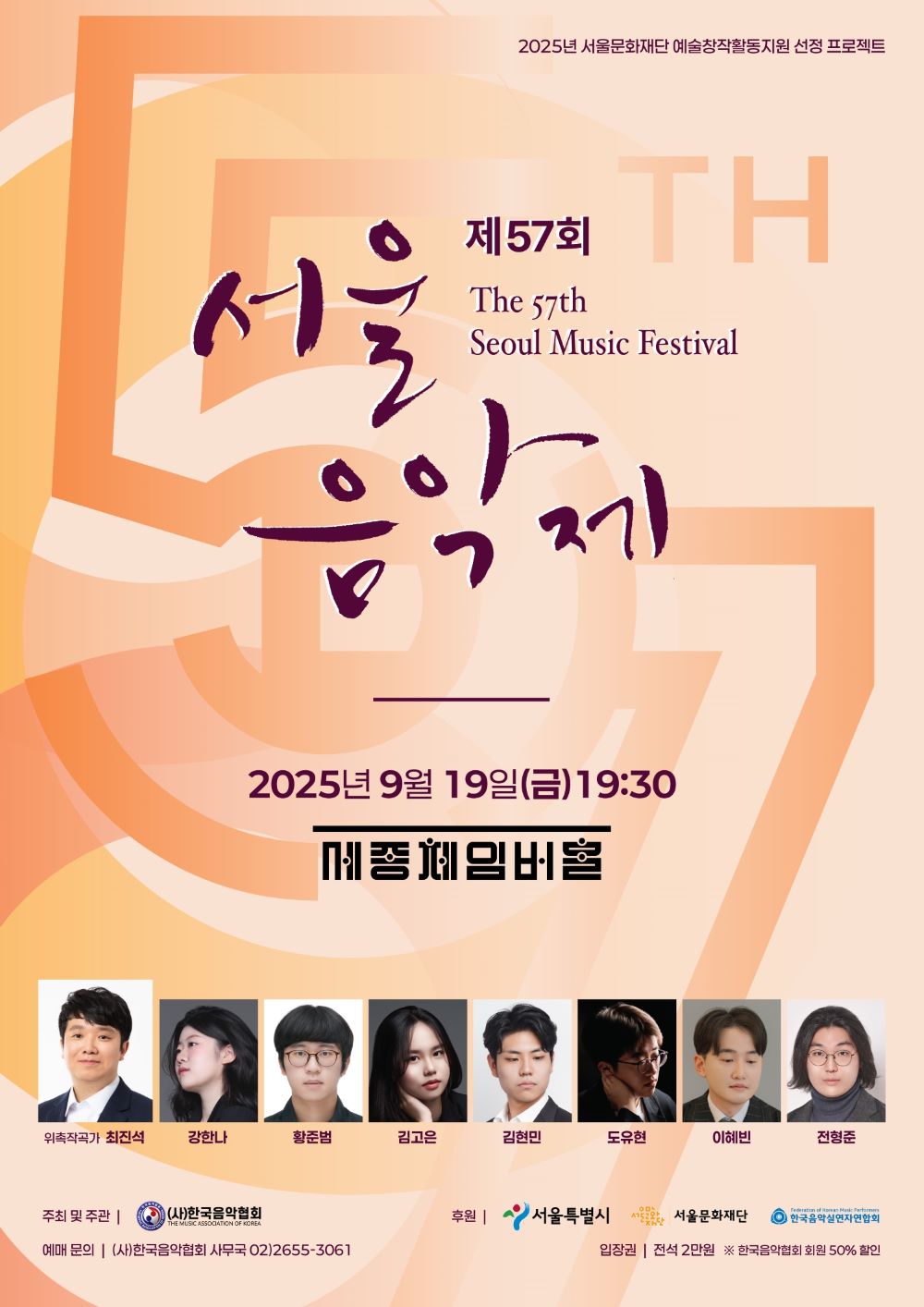제 57회 서울음악제 접수가 7월 7일부터 진행됩니다!서울음악제는우리나라 창작음악 축제 중 가장 오랜 역사와 전통을 가진 음악제이며창작음악의 활성화와 신진 작곡가의 발굴 및 육성에 목적을 두고 있는 음악제 입니다.독창 · 독주 / 실내악 / 대편성 총 세개의 부문으로 나뉘어 있으며,현대적 기법 또는 실험적 작품을 포함한 미발표 작품을 공모받습니다.서울음악제 접수기간2025년 7월 7일(월) ~ 7월 25일(금) 16:00까지한국음악협회 홈페이지(mak.or.kr)에서 접수 가능합니다.경연을 통해 입상한 작품은9월 19일(금) 세종문화회관 체임버홀에서 입상작 연주회를 진행합니다!!자세한 사항은 (사)한국음악협회 홈페이지에서 확인하실 수 있습니다.여러분의 많은 관심과 참여바랍니다!감사합니다.한국음악협회mak.or.kr#한국음악협회 #서울음악제 #2025서울음악제 #사단법인한국음악협회 #제57회서울음악제