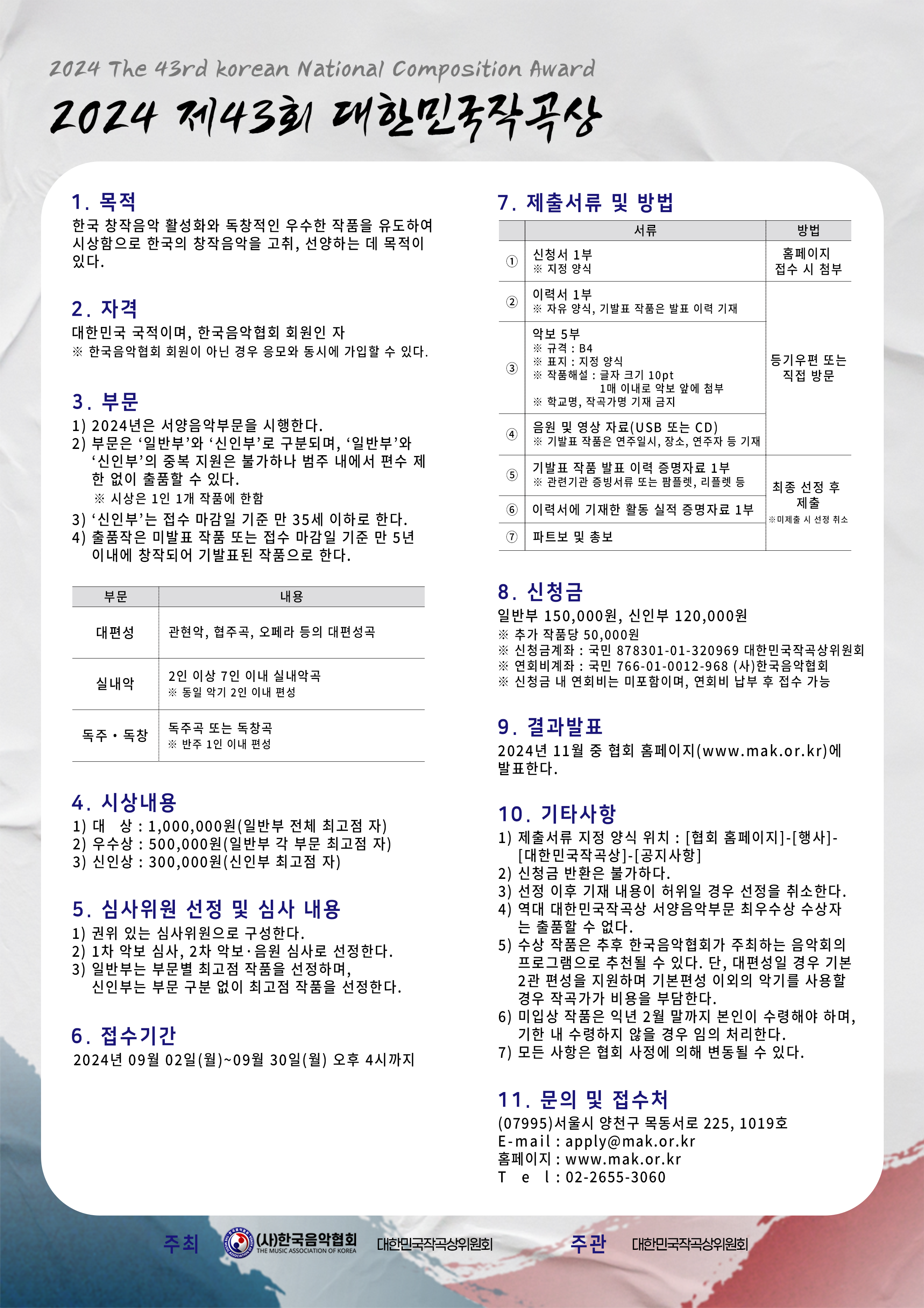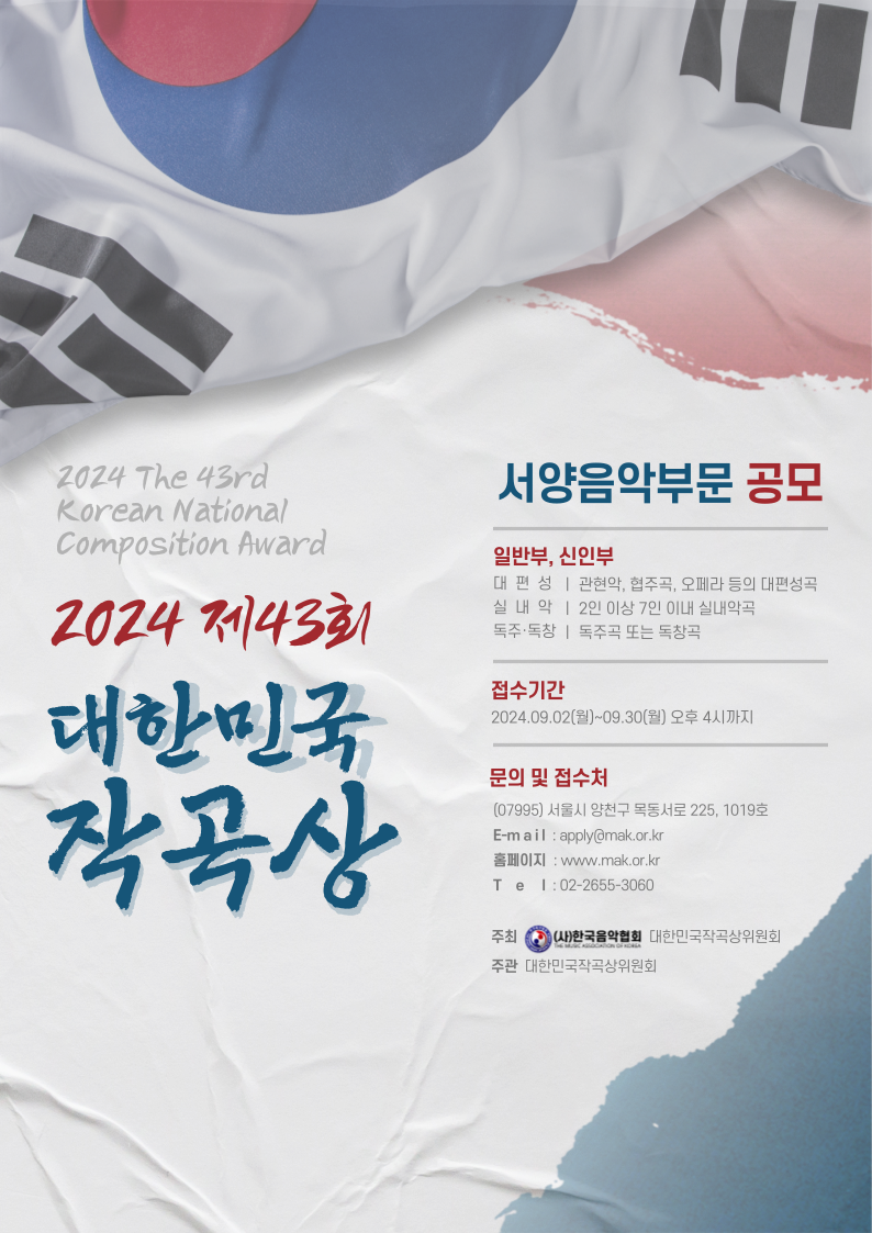 제43회 대한민국 작곡상 공모가 9월 2일부터 진행됩니다!!