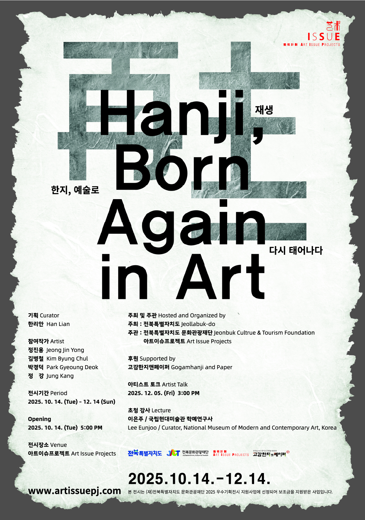 전북특별자치도문화관광재단 ‘우수기획전시 지원사업’에 선정된 아트이슈프로젝트 기획전 ‘재생 再生: 한지, 예술로 다시 태어나다’를 10월 14일부터 12월 14일까지 전주 아트이슈프로젝트에서 선보인다.