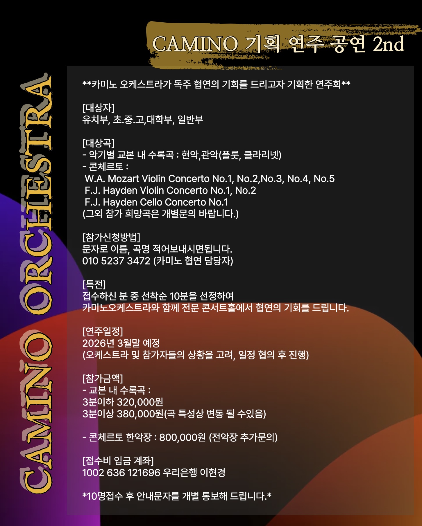 <<CAMINO 기획 연주공연 2.>>카미노 오케스트라가 독주 협연기회를 드리고자 기획한 연주회 (서울 서초동)[대상자]유치부,초•중•고,대학부,일반부[대상곡]*악기별 각 교본내 수록곡 : 현악,관악(플룻,클라리넷)*콘체르토 한악장:-W.A. Mozart Violin Concerto No.1, No.2,No.3, No.4,No.5-F.J. Hayden Violin Concerto No.1, No.2-F.J. Hayden Cello Concerto No.1(그외 참가 희망곡은 개별문의 바랍니다.)[참가신청방법]01052373472(카미노 협연 담당자)문자로 이름,곡명 적어 보내시면됩니다. (예 : 홍길동, 2권 보케리니 미뉴엣트)[연주일정]2026년 3월말 예정(오케스트라 및 참가자들의 상황을 고려,일정 협의후 진행)[참가금액]연주시간 기준3분이하 : 320,000원3분이상 : 380,000원(곡특성상 변동 될 수있음)콘체르토 한악장 : 800,000원(전악장은 전화문의)*10명 접수신청 후 안내문자를 개별 통보 해드립니다.*CAMINO 기획 연주공연 2.(카미노오케스트라)#CAMINO기획연주공연 #카미노오케스트라 #오케스트라 #2026오케스트라 #오케스트라협연 #카미노오케스트라기획연주공연