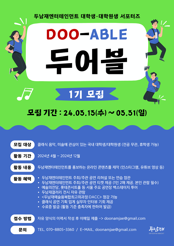 두남재엔터테인먼트의 공연과 두남재갤러리의 전시 소식을 전하는 서포터즈 <두어블> 1기를 모집합니다!