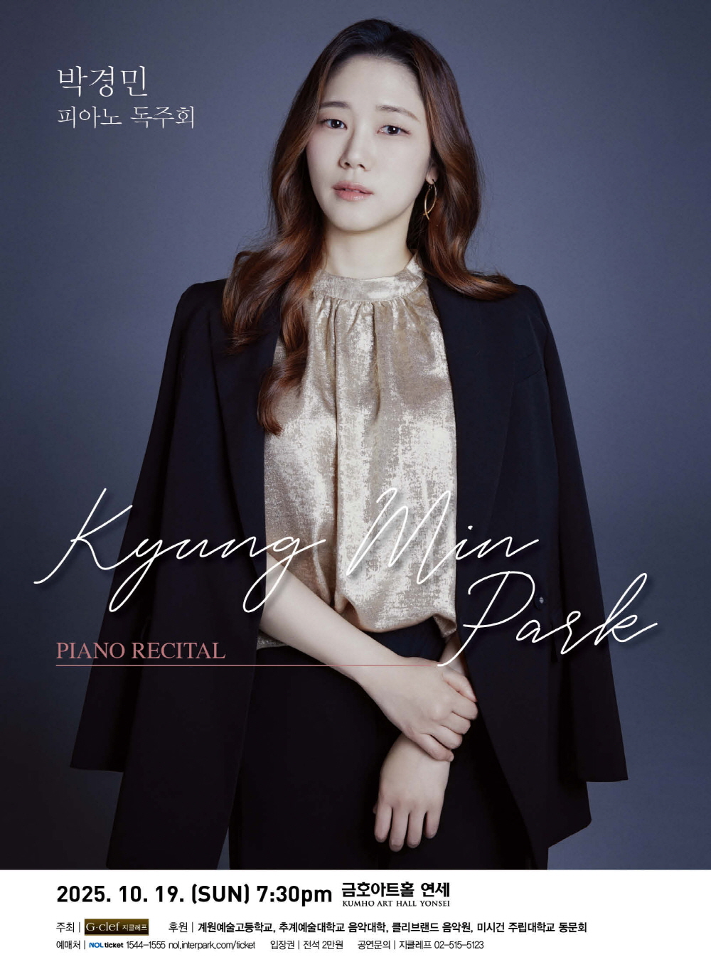 김영진 피아노 독주회22번째 피아노 이야기–건반 위의 회화Young Jin Kim Piano Recital1.일 시: 2025년11월23일(일)오후2시2.장 소:예술의전당 리사이틀홀3.주 최:이든예술기획(주)4.후 원:예원,서울예고 동문회,서울대학교 음악대학 동문회,미국 피바디 음악대학 동문회5.공연문의:이든예술기획(주) 02-6412-3053www.edenclassic.co.kr6.티켓가격:일반석2만원7.예 매 처:www.sac.or.kr1668-1352,https://nol.interpark.com1544-1555,www.yes24.com1544-6399PROFILE깊이 있는 해석과 섬세한 음악적 표현력으로 청중들에게 따뜻한 감동을 전하고 있는 피아니스트 김영진은 예원학교와 서울예술고등학교를 실기우수로 졸업하고,서울대학교 음악대학을 우등으로 졸업하였다.이후 미국으로 건너가Peabody Conservatory of The Johns Hopkins University에서 석사 학위를 취득하고,동 대학원에서 박사 학위를 피바디 음대 역사상 가장 최단 기간인3년만에 취득하였다.박사 학위 논문[Isang Yun’s Creative Musical Bridges between East and West: 5 Stücke fur Klavier, Interludium A fur Klavier and Espace I for Cello and Piano]은 피바디 음대Academic Faculty교수들로부터 최우수 논문 중의 하나라는 호평을 들었으며,박사 학위 논문을 바탕으로 한Lecture Recital에 참관한Marian Hahn, Richard Giarusso, Brian Ganz, Andrew Talle교수들로부터“학구적이고 논리 정연한 강의와 심금을 울리는 섬세하고 호소력 짙은 연주”라는 찬사를 들었다.어린 시절부터 뛰어난 음악적 재능을 선보인 김영진은 소년한국일보 콩쿨 은상,조선일보 콩쿨2등,음연 피아노 콩쿨1등,이화 경향 콩쿨3등,한국일보 콩쿨3등,예원 예고 실내악 콩쿨1등,서울심포니 오케스트라 콩쿨1등,음악저널 콩쿨 대상,난파음악 콩쿨 대상,한국 쇼팽 피아노 콩쿨2등,한국피아노학회 콩쿨에서 입상하였으며 독일의Darmstadt에서 열린Jubilaumssaison Internationaler Klavier Competition 2등 및 청중들에게 가장 인기가 많은 연주자에게 주어지는Public상을 받았고,미국의Yale Gordon Piano Competition Finalist에 오르는 등 국내외 유수의 콩쿨에서 상위 입상하며 두각을 나타내었다.일찍이 다양한 연주 무대를 통해 유망주로 인정을 받았던 그는1994년 문예회관 대극장<젊은이의 음악제>초청 연주를 시작으로 서울시립교향악단 오디션에 합격하여 세종문화회관 대강당에서 서울시향과 협연을 하였으며, 1995년 월간 피아노음악 주최<리틀 피아니스트 기획연주회>에 출연하였고, 1996년 예원학교 시절 실기수석 재학생 대표로 예원학교 정기 연주회에 출연하여 예원 오케스트라와 협연을 하며 그 실력을 인정받았다.또한, 1997년 서울심포니 오케스트라 초청으로 연세대학교 백주년 기념관에서 협연 무대를 가졌으며1998년 동아일보 주최 신인 아티스트 초청 연주(한국프레스 센터), 2000년 한국피아노학회 우수신인 음악회 초청 연주,서울대학교 재학생 연주회 및 춘계연주회를 통해 다양한 연주 경험을 쌓았다. 2003년 금호문화재단 아티스트 오디션에 합격하여 금호아트홀 초청<아티스트 콘서트 시리즈>독주회를 하였으며,유림아트홀,서울대학교 음악대학 예술관 콘서트홀,예술의전당 리사이틀홀,이원문화센터 이원아트홀 등에서 수차례의 독주회를 개최하였다.음악에 대한 열정은 계속되어 미국 뉴욕의New Paltz Summer Music Festival,독일의Darmstadt Internationalen Meisterkurs와 체코Prague International Piano Festival등에 참가하여 연주하였으며,미국의Miriam, A. Concert Hall, Goodwin Recital Hall, Griswold Hall등에서 수차례의 독주회를 개최하며 폭넓은 연주 무대를 통해 뛰어난 연주 실력을 인정 받았다.2010년 귀국 후, 2011년 예술의전당 리사이틀홀에서 귀국 독주회를 통해 음악적 입지를 더욱 단단히 한 피아니스트 김영진은 이후에도 매년 다양한 주제와 폭넓은 프로그램들로 구성된 수차례의 독주회를 개최하며 청중들과 소통하고 있다.수차례의 독주회를 통해“그윽한 낭만적 향기와 섬세하고 호소력 짙은 풍부한 음색,학구적으로 음악을 분석하는 통찰력과 열정과 카리스마를 지닌 연주,풍부한 감수성을 바탕으로 한 깊은 음악적 표현으로 청중들을 매료시키는 연주”라는 호평을 받고 있다.협연과 다양한 실내악 무대를 통해서도 활발한 연주활동을 하고 있는 피아니스트 김영진은2012년 고려대학교 동문 오케스트라 초청으로 고우 오케스트라와 협연 하였으며2013년<코리아타임스 창간63주년 기념 신춘음악회>에 신예 연주자로 초청되어 모스틀리 필하모닉 오케스트라와 협연 무대를 가졌으며2015년에는 고려대학교 동문 오케스트라 재초청으로 차이콥스키 피아노 협주곡을 연주하여 호평을 받았다. 2013년 평촌아트홀 초청<그 남자의 초대>실내악 연주, KT와 함께하는<토요일 오후의 실내악>연주 영상이<예술TV arte채널>에 방영되기도 하였고, 2015년 예술의전당IBK챔버홀에서<앙상블M정기연주회>와2018년 예술의전당 리사이틀홀<한국피아노 두오협회 제62회 정기연주회>와 한국피아노학회<그랜드 피아노 콘서트>에 초청되어 연주하였다.그외에도 다양한 형태의 무대를 통해 관객들과 소통하고 있는 김영진은 전남대학교 예술대학 주최<전남대학교 피아노 교수음악회>, 2019년<제13회 한국음악교수협의회 정기연주회>와 영산양재홀 기획초청<김효진 김영