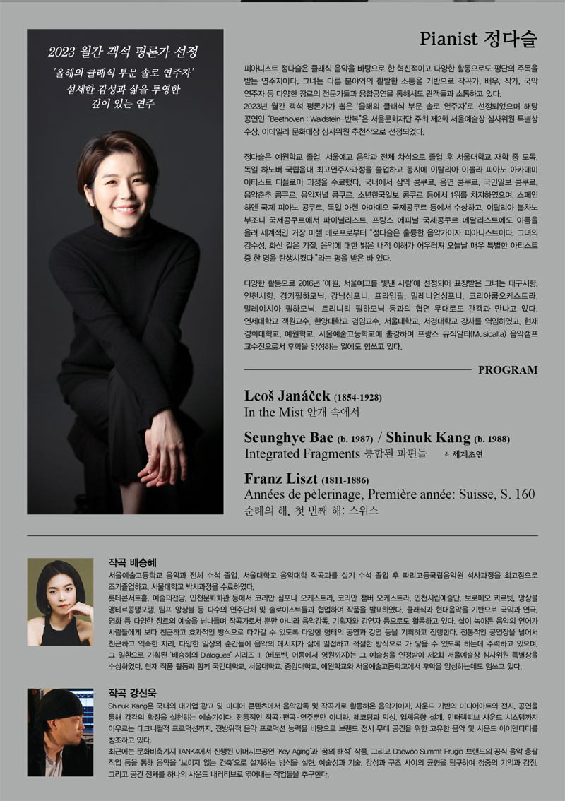 피아니스트 정다슬은 클래식 음악을 바탕으로 한 혁신적이고 다양한 활동으로도 평단의 주목을 받는 연주자이다. 그녀는 다른 분야와의 활발한 소통을 기반으로 작곡가, 배우, 작가, 국악 연주자 등 다양한 장르의 전문가들과 융합공연을 통해서도 관객들과 소통하고 있다.