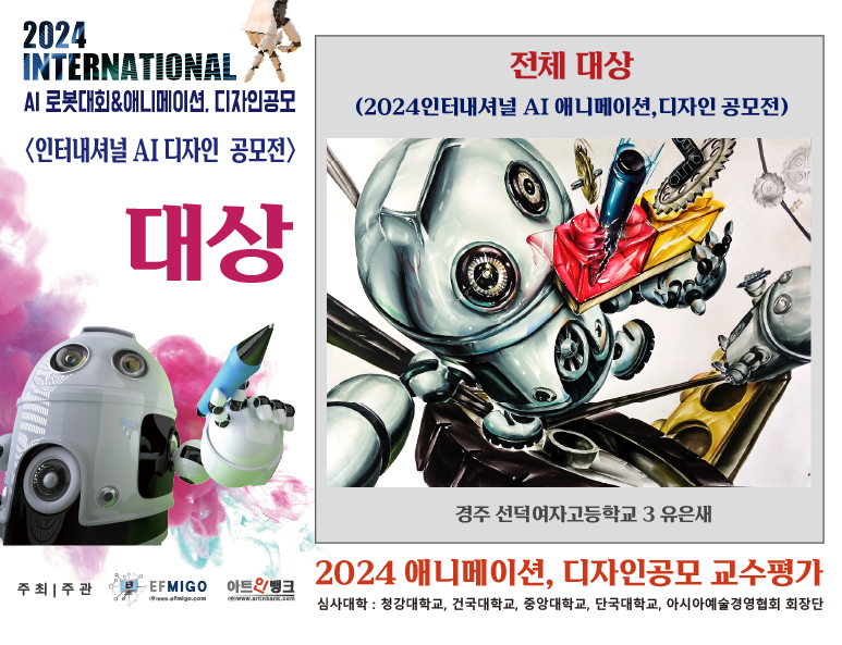 여수입시미술학원(지도자상 여수 디자인애니위너미술학원)국제AI애니메이션,디자인공모전-아트인뱅크여수미술학원 디자인애니위너 미술학원(디자인/애니 입시미술학원)심사대학 : 청강대학교, 건국대학교, 중앙대학교, 단국대학교, 아시아예술경영협회 회장단(애니메이션과, 디자인학과, 회화과, 기타학과 교수님들로 심사)2024 인터내셔널 AI 로봇대회 & 애니메이션 디자인 대회인터내셔널 AI 애니메이션 대회 칸만화부분은상, 동상 수상지도자상 수상여수 디자인애니위너미술학원(디자인입시,애니입시미술학원)여수 디자인애니위너미술학원 천현준 원장님2024 인터내셔널 AI로봇대회 & 애니메이션, 디자인 공모전주최 / 주관 : ㈜EFMIGO(에프미고), ㈜아트인뱅크심사일시 : 2024. 8. 10(토)심사장소 : 인천 로봇랜드 로봇타워심사대상 : 국내외 초,중,고등학교 및 홈스쿨링심사대학 : 청강대학교, 건국대학교, 중앙대학교, 단국대학교, 아시아예술경영협회 회장단(애니메이션과, 디자인학과, 회화과, 기타학과 교수님들로 심사)이번대회는인터내셔널 AI로봇대회인터내셔널 AI 디자인 공모전인터내셔널 AI 애니메이션 공모전순으로 평가가 진행되었다.디자인과 애니메이션 공모에서는 한 대학의 교수진의 입시평가가 아닌 중요 대학 교수님들을 모셔 분야별 평가를 하면서 대학입시에 학교마다의 특성과 입시발전을 모색하는 자리기도 하였다. 특히 언론사에서 후원하는 공식력 있는 대회이기 때문에 많은 학생들이 참여 하였고, 고등부의 참여률이 상당하였다.AI와 로봇대회를 통하여 애니메이션과 디자인을 함께하는 대회는 이번이 처음이다.전국의 많은 학생들이 수상을 하였고 우수한 인재들을 양성하는 지도자 분들에게 감사할 따름이다.2024 인터내셔널 AI 디자인 공모전2024 인터내셔널 AI 애니메이션 공모전디자인,애니메이션 구분없이 지역별 지도자상에는 아래와 같은 소속의 학원들이 수상을 하였다.애니쿠나 만화학원 창원캠퍼스 원종수 원장님, 경주 브이스토리 미술학원 윤태호 원장님,창원 코코 입시 미술학원 최서후 선생님, 마산 코코 입시 미술학원 유준석 원장님,홍대 윤쌤 미술학원 조수민 원장님,,순천 에이스 미술학원 백형인 원장님,동탄 코코 입시 미술학원 최현아 선생님, 여수 디자인 애니 위너 미술학원 천현준 원장님#여수미술학원 #여수입시미술학원 #여수애니학원 #여수애니메이션학원 #여수애니미술학원 #여수웹툰만화학원 #여수만화학원 #여수디자인미술학원 #여수디자인학원 #여수디자인애니위너미술학원 #아트인뱅크 #에프미고 #청강대학교애니과교수평가 #청강대교수평가 #청강대학교애니과 #여수미술학원청강대