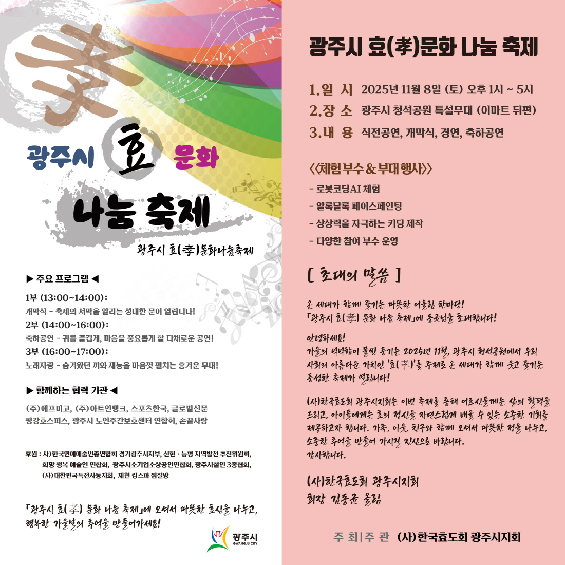(사)한국효도회 광주시지회가 주최·주관하는 **“광주시 효(孝) 문화 나눔 축제”**가 오는 11월 8일(토) 오후 1시부터 5시까지 광주시 청석공원 특설무대(이마트 뒤편)에서 열린다. 이번 행사는 지역 주민과 가족, 친구 등 모든 세대가 함께 모여 효의 의미를 체험하고 즐길 수 있도록 마련됐다.