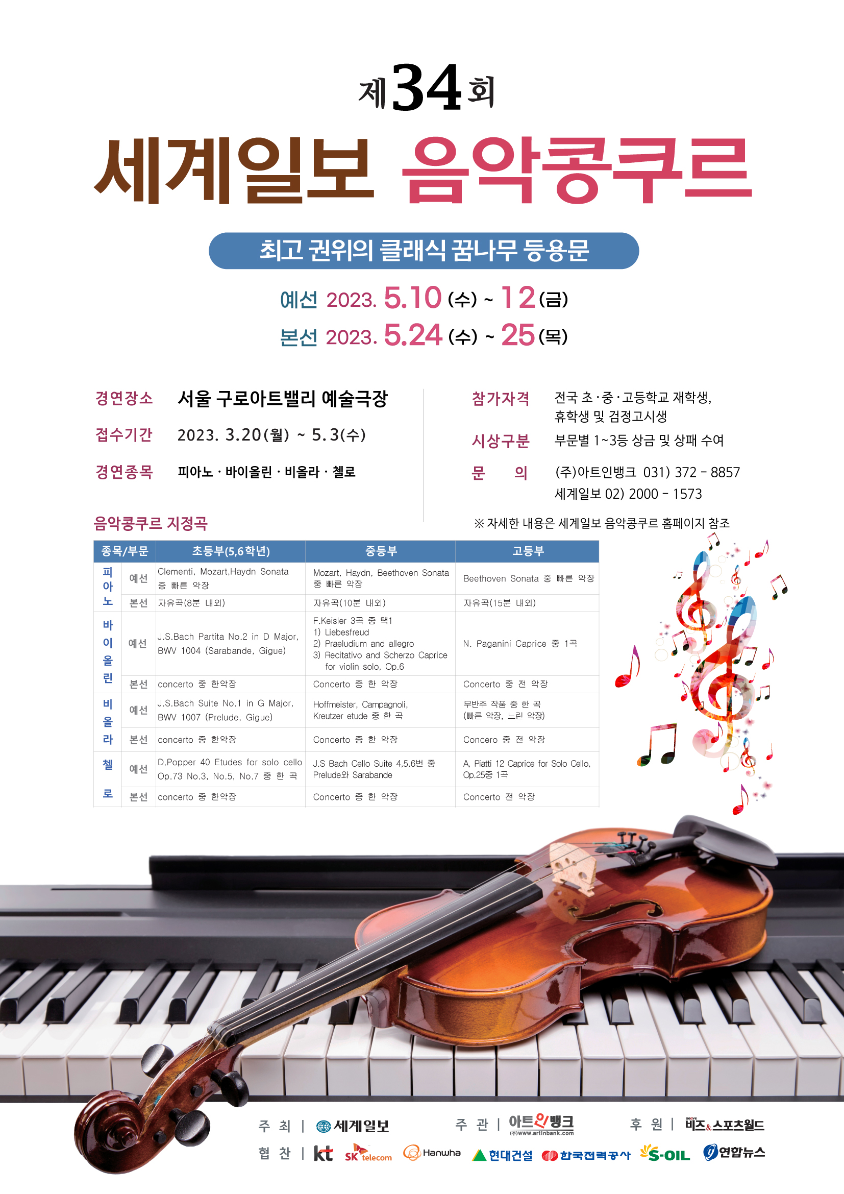 #세계일보음악콩쿠르 #34회세계일보음악콩쿠르 #세계일보음악콩쿨 #세계음악콩쿠르 #세계일보음악경연대회 #음악콩쿠르 #음악경연대회 #음악콩쿨 #전국음악콩쿠르 #예중예고음악콩쿠르 #2023음악콩쿨 #2023음악콩쿠르 #2023음악경연대회 #동아음악콩쿠르 #전국학생음악콩쿠르 #초등학생음악콩쿠르 #중학생음악콩쿠르 #고등학생음악콩쿠르 #아트인뱅크 #구로아트밸리 #피아노콩쿨 #피아노콩쿠르 #바이올린콩쿨 #바이올린콩쿠르 #비올라콩쿨 #비올라콩쿠르 #첼로콩쿨 #첼로콩쿠르 #피아노경연대회 #음악대회 #예중예고콩쿠르 #예중계고콩쿨 #음악학원 #서울예고 #선화예고