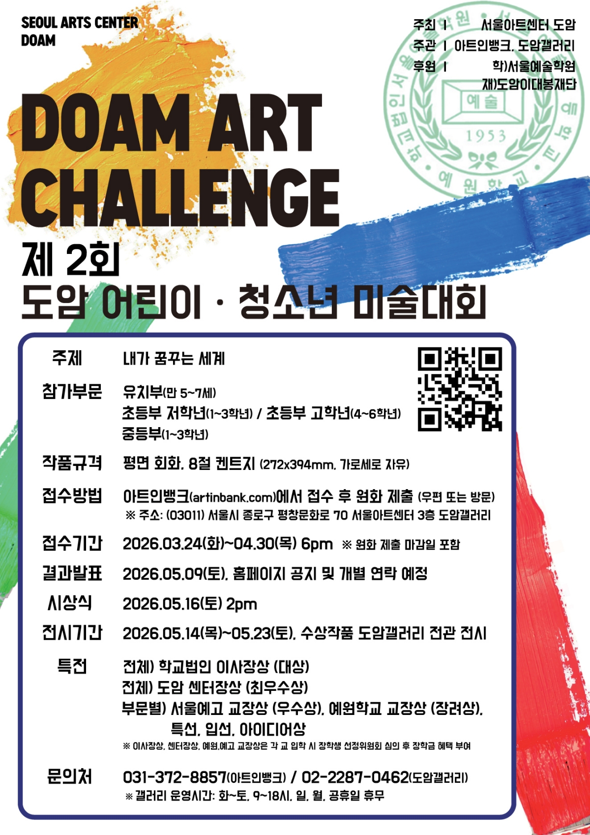 서울 종로구 평창동에 위치한 서울아트센터 도암이 전국 어린이와 청소년의 창의적 예술표현을 지원하기 위해‘제2회 도암어린이ᆞ청소년 미술대회’를 개최한다. 이번 대회는 미술을 통해 어린이와 청소년이 자신만의 예술적 상상력과 감수성을 자유롭게 표현할 수 있는 창작의 장을 마련하고자 기획됐다.